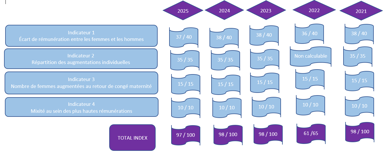 Cet indicateur a pour ambition de promouvoir l’égalité professionnelle entre les femmes et les hommes à travers 4 indicateurs, sur une échelle de 100 :